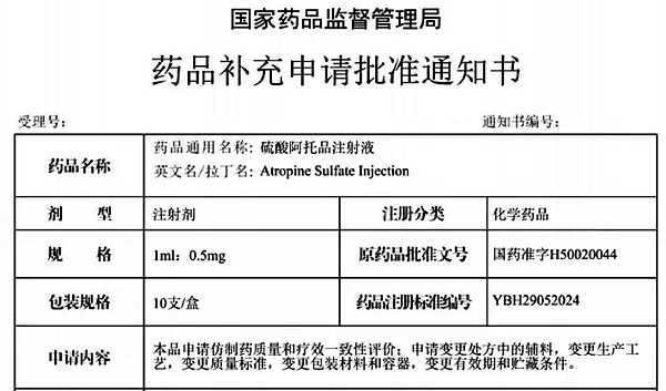 硫酸阿托品注射液获一致性评价补充申请批件