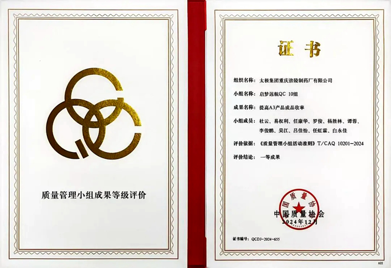 近日,2024年中国质量协会公布了全国质量管理小组(简称“QC小组”)评选结果,国药太极涪陵制药厂“提高A3产品成品收率”项目荣获2024年全国一等成果奖,该奖项为我国QC成果奖项最高荣誉。至此,该项目和QC小组已摘取行业协会级、集团级、中央企业级、省级、国家级所有阶段荣誉,实现“大满贯”。