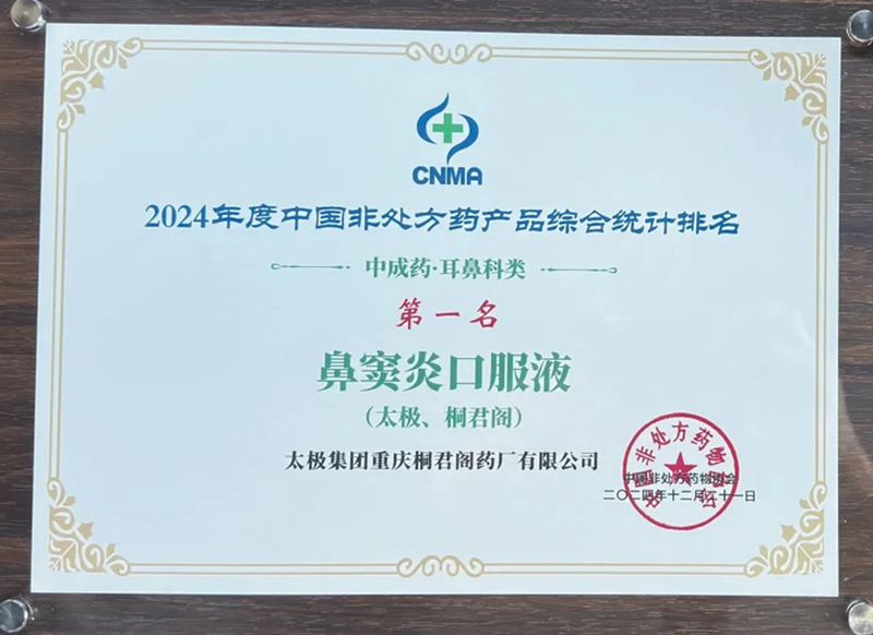 荣获中成药耳鼻科类第1名