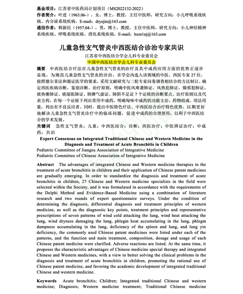 2024年12月,由中国中西医结合学会儿科专业委员会、江苏省中西医结合学会儿科专业委员会牵头,组织学会内中医、西医专家共同编制的《儿童急性支气管炎中西医结合诊治专家共识》正式发布在《世界中医药》杂志,急支糖浆成功入选。