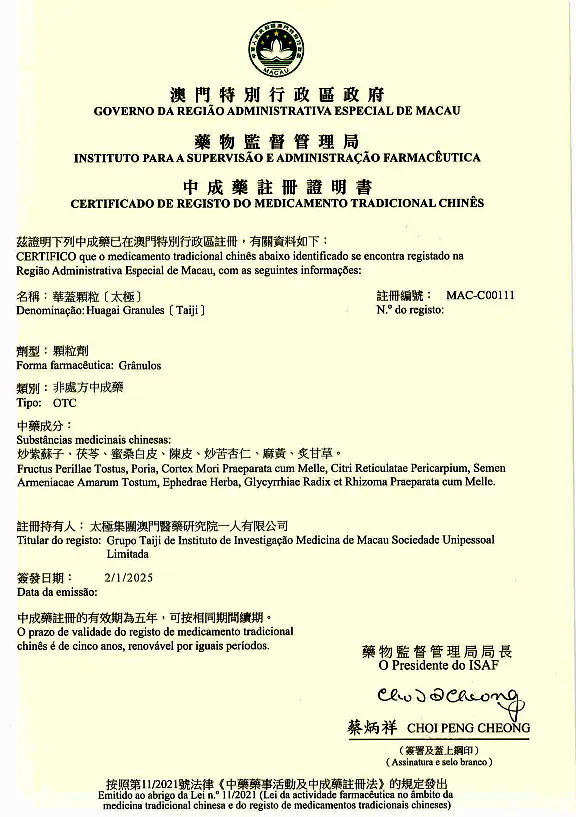 1月2日,国药太极华盖颗粒成功获得澳门药物监督管理局颁发的《中成药注册证明书》,为该局成立后批准的首个经典名方中药复方制剂。太极华盖颗粒处方来源于宋代《太平惠民和剂局方》中的“华盖散”,具有宣肺解表,祛痰止咳的功效,用于素体痰多,肺感风寒,是国药太极呼吸系统领域除“急支糖浆”外又一代表品种。