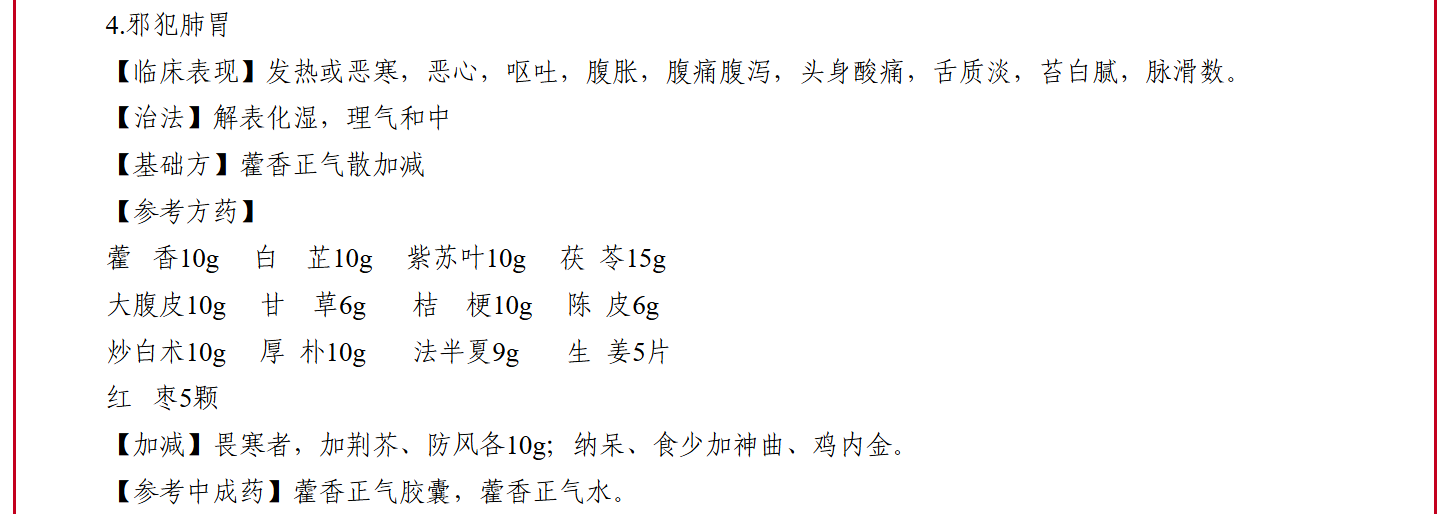 【参考方药】藿香10g 白芷10g 紫苏叶10g 茯苓15g 大腹皮10g 甘草6g 桔梗10g 陈皮6g 炒白术10g 厚朴10g 法半夏9g 生姜5片 红枣5颗