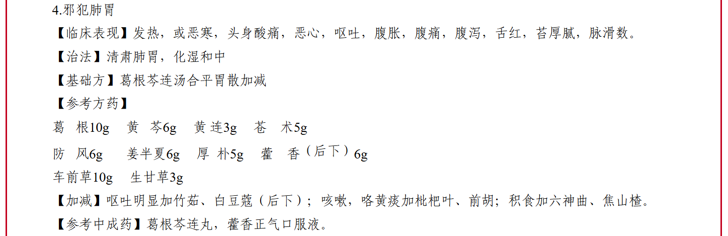 【参考方药】葛根10g 黄芩6g 黄连3g 苍术5g 防风6g 姜半夏6g 厚朴5g 藿香(后下)6g 车前草10g 生甘草3g