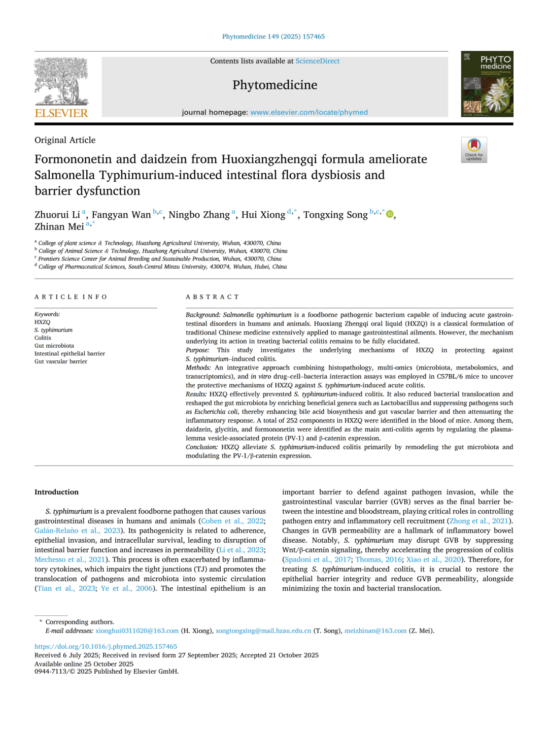 近日,太极藿香正气口服液防治鼠伤寒沙门氏菌诱导的结肠炎机制研究方面取得重要进展,相关成果发表于国际权威期刊《Phytomedicine》(IF:8.3)。