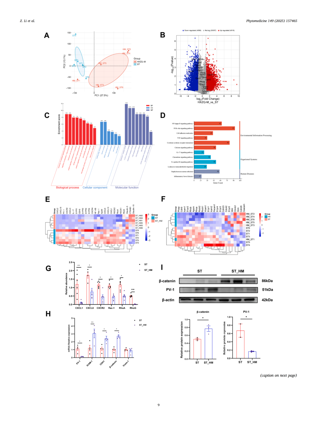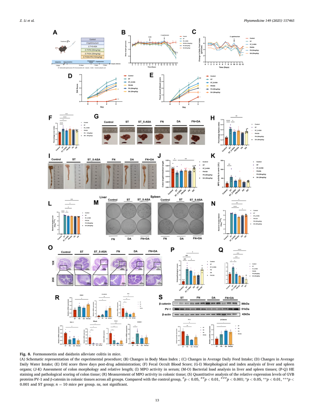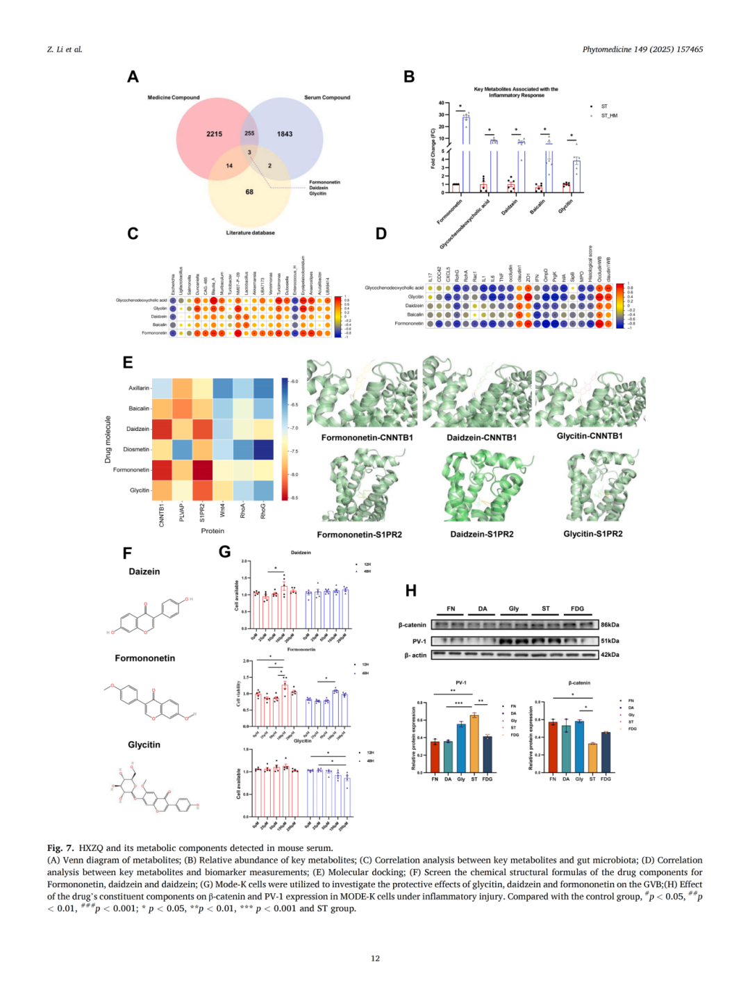 该研究通过多组学整合分析及体内外实验,系统阐释了太极藿香正气口服液通过重塑肠道菌群和调节血浆膜囊泡相关蛋白(Plasmalemma Vesicle-Associated Protein, PV-1)/β-连环蛋白(β-catenin)的表达来缓解鼠伤寒沙门氏菌诱导的结肠炎。研究进一步锁定芒柄花素(Formononetin)与大豆苷元(Daidzein)为太极藿香正气口服液抗结肠炎的主要活性成分。