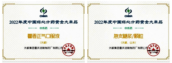 藿香正气口服液、急支糖浆/颗粒入选“2022年度中国非处方药黄金大单品”,共计18个产品入选。此外,藿香正气口服液还荣获“中成药·感冒暑湿类”第一名,急支糖浆获“中成药·止咳化痰平喘类”第二名。