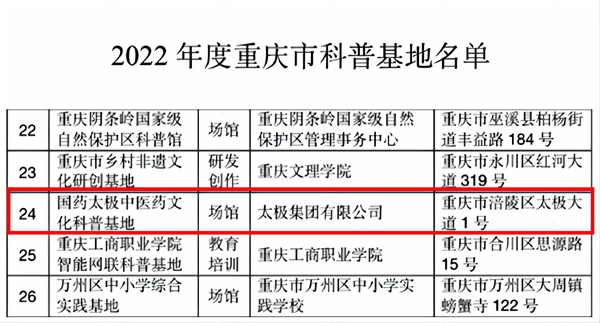 国药太极中医药文化科普基地被命名为重庆市科普基地