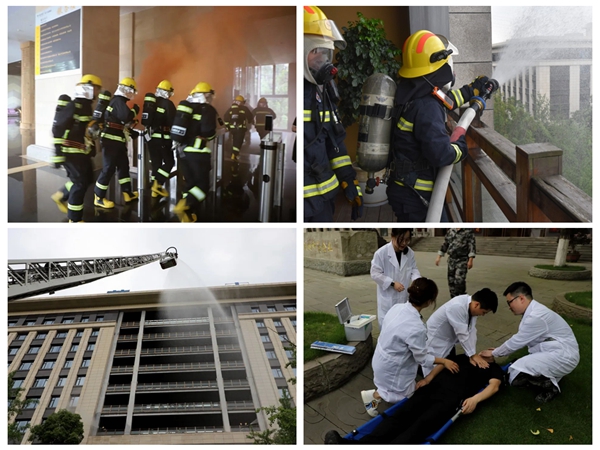 模拟场景中六楼有一名人员被困火场,通过窗户向外呼救。灭火行动组利用大楼室内消火栓连接2支水枪协助灭火,同时展开搜救行动,护送被困人员到达安全区域。被困人员因吸入过多烟气,安全救护组立即开展心肺复苏等施救措施,并安排车辆和救护人员将其送至医院进行进一步救治。