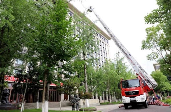 现场警戒组设置警戒线,防止非救援人员进入警戒区域。消防车抵达后,消防官兵根据现场实际情况,迅速启用云梯开启高压水灭火。