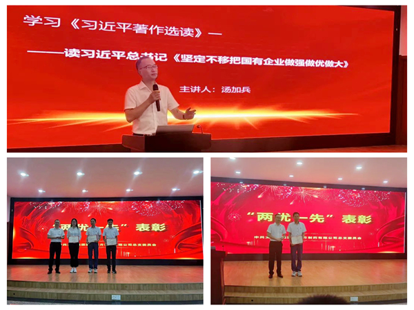 党总支书记汤加兵带领大家学习《习近平著作选读》——《坚定不移把国企做强做优做大》《发展数字经济、抢占未来发展制高点》,表彰“两优一先”,鼓励广大党员干部脚踏实地、积极向上,为企业高质量发展贡献力量。