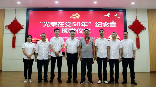 四川天诚制药党委书记陈勇为党龄50周年老党员颁发“光荣在党50年”纪念章,并致以节日的问候和祝福。号召广大青年党员向老党员学习,进一步弘扬党的优良作风,勇挑重担、接续奋斗,以更加昂扬的斗志和干劲投身企业高质量发展中。
