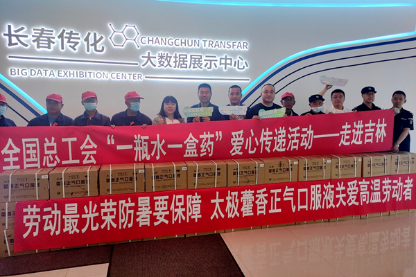 此外,国药太极志愿者顶着热浪,将一盒盒藿香正气口服液送达广东农垦集团工会、中建五局、通辽市第一运输、长春传化公路港物流、全总井冈山培训基地等单位,用实际行动为劳动者们撑起一把把“遮阳伞”。