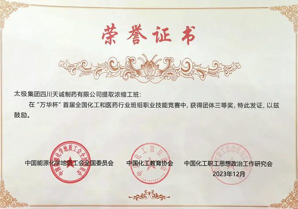 12月20日,“万华杯”首届全国化工和医药行业班组职业技能竞赛决赛,在山东烟台成功举办,来自全国28个省(区、市)、330家企业的1397个班组经过层层选拔,最终共有60支班组代表队进入决赛。国药集团4支队伍进入决赛,其中,国药太极四川天诚制药浓缩提取工班班组位列其中。