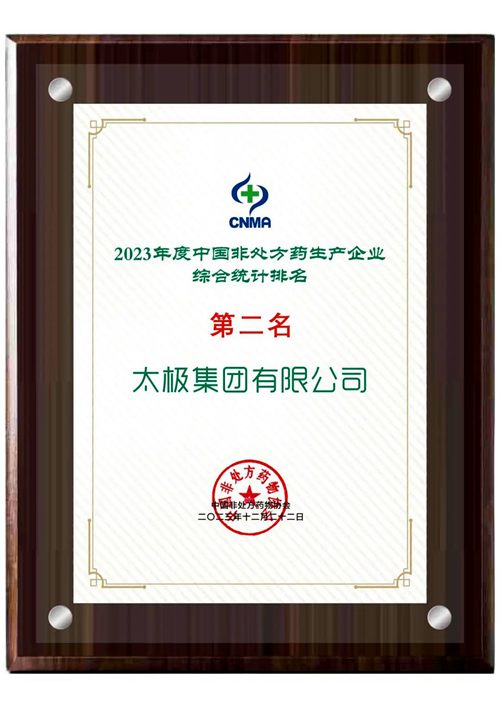 太极集团荣获“2023年度中国非处方药生产企业综合统计排名”第二名。