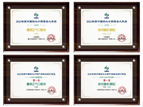 藿香正气口服液、急支糖浆/颗粒入选“2023年度中国非处方药黄金大单品”。此外,藿香正气口服液还荣获“2023年度中国非处方药产品综合统计排名(中成药·感冒暑湿类)”第一名,急支糖浆/颗粒荣获“2023年度中国非处方药产品综合统计排名(中成药·咳嗽化痰平喘类)”第一名。