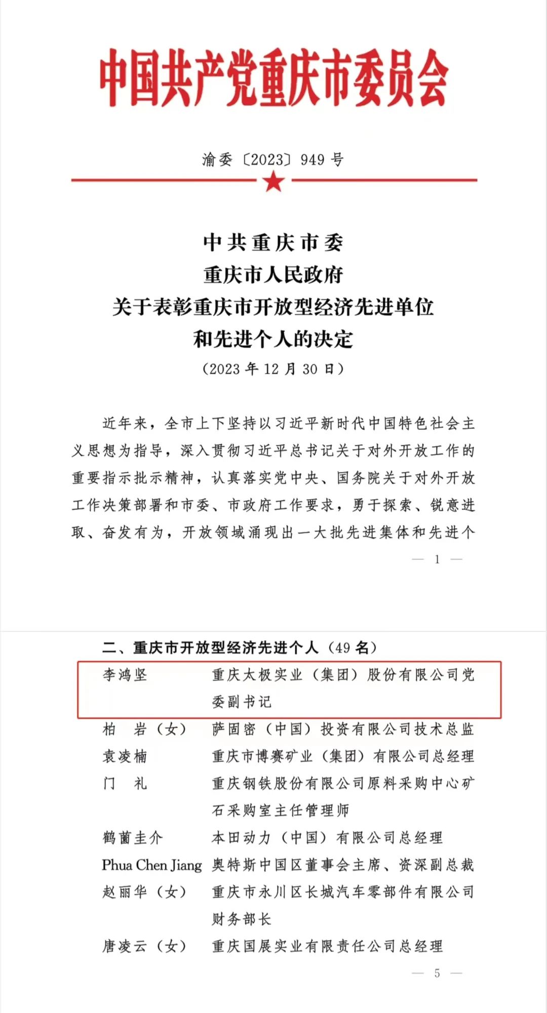 近日,重庆市委、市政府发布《关于表彰重庆市开放型经济先进单位和先进个人的决定》,对全市49个单位、49名个人予以表彰。重庆太极实业(集团)股份有限公司党委副书记李鸿坚被评为重庆市开放型经济先进个人。