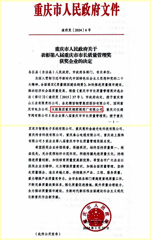 近日,重庆市人民政府发出通报,授予5家单位重庆市市长质量管理奖,太极集团重庆桐君阁药厂作为公司首家获得此奖项的企业,榜上有名!