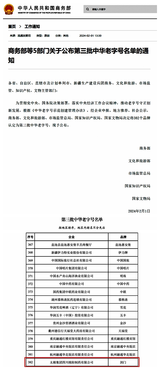 2月1日,商务部等5部门公布了“第三批中华老字号”名单,太极集团四川绵阳制药有限公司“剑门”品牌榜上有名。