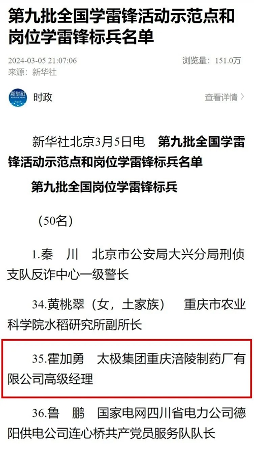3月5日,第九批50个全国学雷锋活动示范点和50名全国岗位学雷锋标兵名单公布,国药太极涪陵制药厂高级经理、特级技师霍加勇入选“全国岗位学雷锋标兵”。