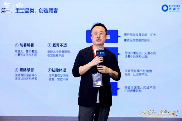 焦点品牌咨询合伙人王馨以太极藿香正气口服液案例,解析通过品牌战略破圈,实现确定性、可持续的增长。他表示,通过人群突破,提升品类发展势能,扩大藿香品牌发展的空间,围绕祛暑祛湿,拓展不同场景中的各种人群;通过场景突破,突破原有季节性销售局限,让淡季不淡,突破全国南北区域不同生活场景限制。