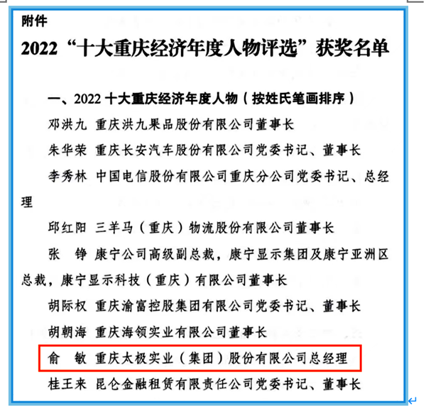 9月7日,“2022十大重庆经济年度人物”获奖名单公布,国药太极总经理俞敏,以其卓越的领导力和对行业的突出贡献,成功荣获“2022十大重庆经济年度人物”与“2022十大重庆经济改革创新案例”两项大奖,也是奖项中唯一在人物和案例中获奖的企业。