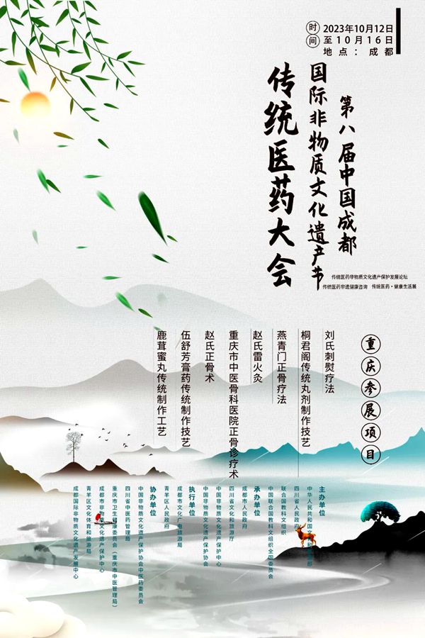 2023年10月12日至16日,由中华人民共和国文化和旅游部、四川省人民政府、联合国教科文组织、中国联合国教科文组织全国委员会主办,成都市人民政府、四川省文化和旅游厅等单位承办,重庆市卫生健康委员会(重庆市中医管理局)参与协办的第八届中国成都国际非物质文化遗产节传统医药大会在成都非遗博览园顺利举行。