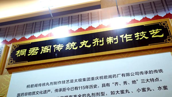 桐君阁传统丸剂制作技艺是太极集团重庆桐君阁药厂有限公司传承的国家级传统医药类非物质文化遗产保护项目。清光绪34年(1908年),重庆名仕许健安因仰慕药祖桐君圣德创办桐君阁熟药房,百余年来,历代桐君阁人守正清源、传承创新,形成了独特的中成药制作技艺。2011年,该技艺被列入国家级非物质文化遗产代表性项目名录,桐君阁传统丸剂制作技艺精选道地药材、遵古炮制、一药一法、细腻高超,既有普遍性又有鲜明的重庆地域特征,在业界独树一帜。