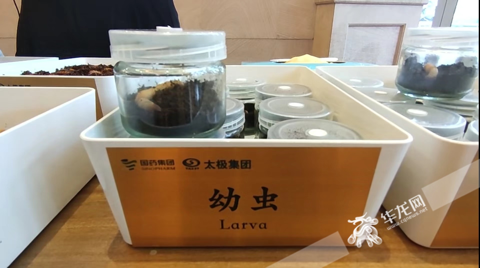 “看,这是冬虫夏草生活史的各个阶段,首先是冬虫夏草寄主昆虫蝙蝠蛾幼虫,幼虫被虫草菌侵染死亡后形成僵虫,未僵化的即化为蛹,最后僵虫经过栽种生长为虫草。”太极集团中药高科基地主管郎鑫源介绍。