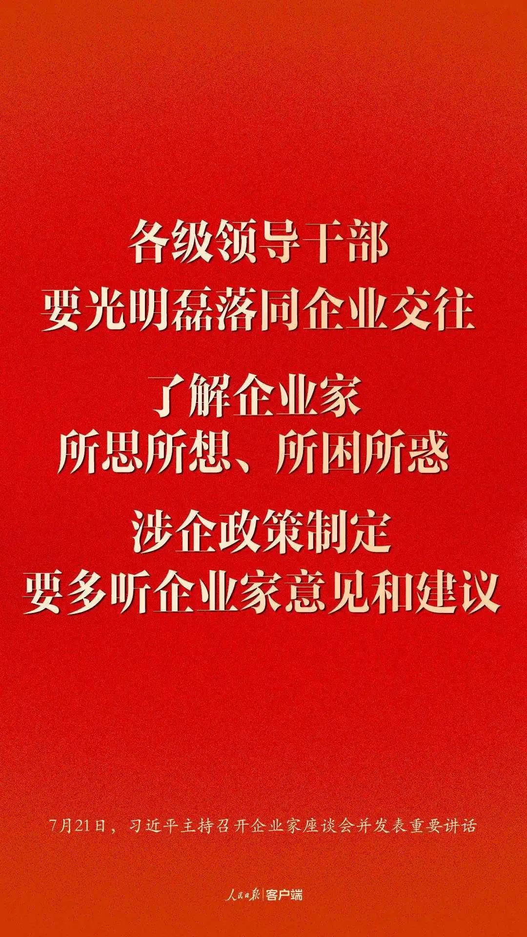 7月21日,中共中央总书记、国家主席、中央军委主席习近平在京主持召开企业家座谈会并发表重要讲话。习近平强调:激发市场主体活力,弘扬企业家精神,推动企业发挥更大作用,实现更大发展。