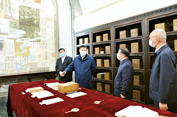 2023年6月2日,中共中央总书记、国家主席、中央军委主席习近平在北京出席文化传承发展座谈会并发表重要讲话。这是座谈会前,习近平1日下午在中国国家版本馆考察时,在兰台洞库了解馆藏精品版本保存情况。新华社记者 鞠鹏/摄