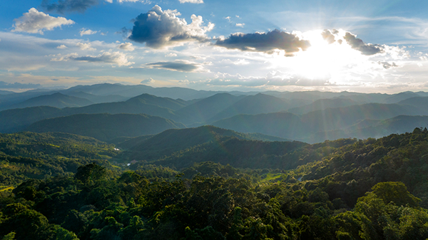 这是2023年9月16日拍摄的日落时分的云南普洱景迈山风光(无人机照片)。新华社记者 胡超 摄