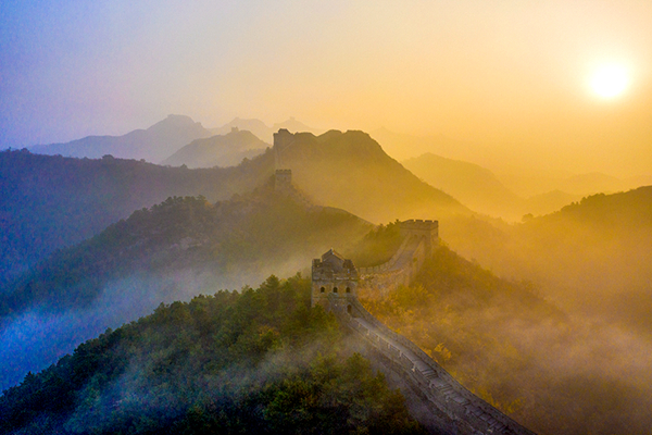 这是2023年11月1日拍摄的河北承德金山岭长城日出景观(无人机照片)。新华社发(周万平 摄)