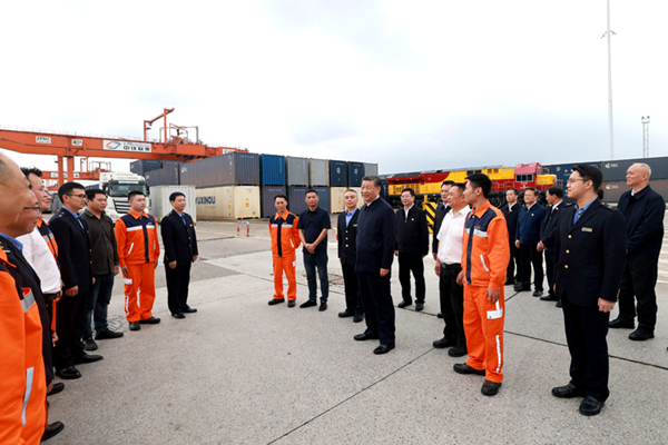 4月22日至24日,中共中央总书记、国家主席、中央军委主席习近平在重庆考察。这是22日下午,习近平在重庆国际物流枢纽园区重庆铁路集装箱中心站,同货车司机、列车司机、装卸工人、场站管理人员等亲切交流。新华社记者 岳月伟 摄