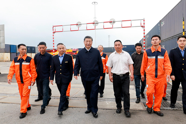 随后,习近平来到重庆铁路集装箱中心站,听取货物集散、运输路径、运营成本和效益等介绍,同货车司机、列车司机、装卸工人、场站管理人员等亲切交流,询问他们的工作强度、劳动保护、节假日休息和收入情况。习近平说,大家在物流一线,也是在对外开放一线,通过你们的辛勤劳动,很多商品跨越山海、走向世界,你们的工作很有意义。推动西部大开放、促进西部大开发,物流很重要,大家要继续努力,不断创造新的业绩,作出新的贡献。