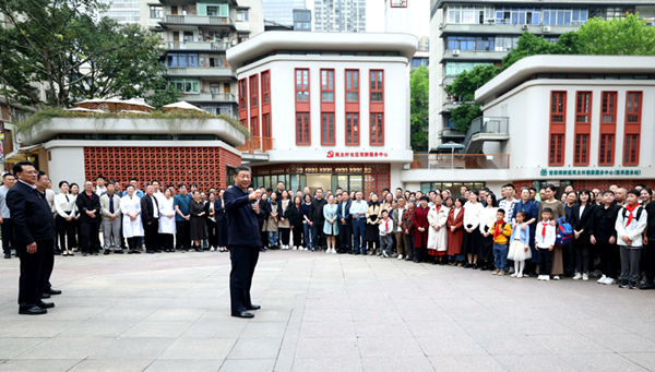 4月22日至24日,中共中央总书记、国家主席、中央军委主席习近平在重庆考察。这是22日下午,习近平在九龙坡区谢家湾街道民主村社区考察时,同社区居民亲切交流。新华社记者 王晔 摄