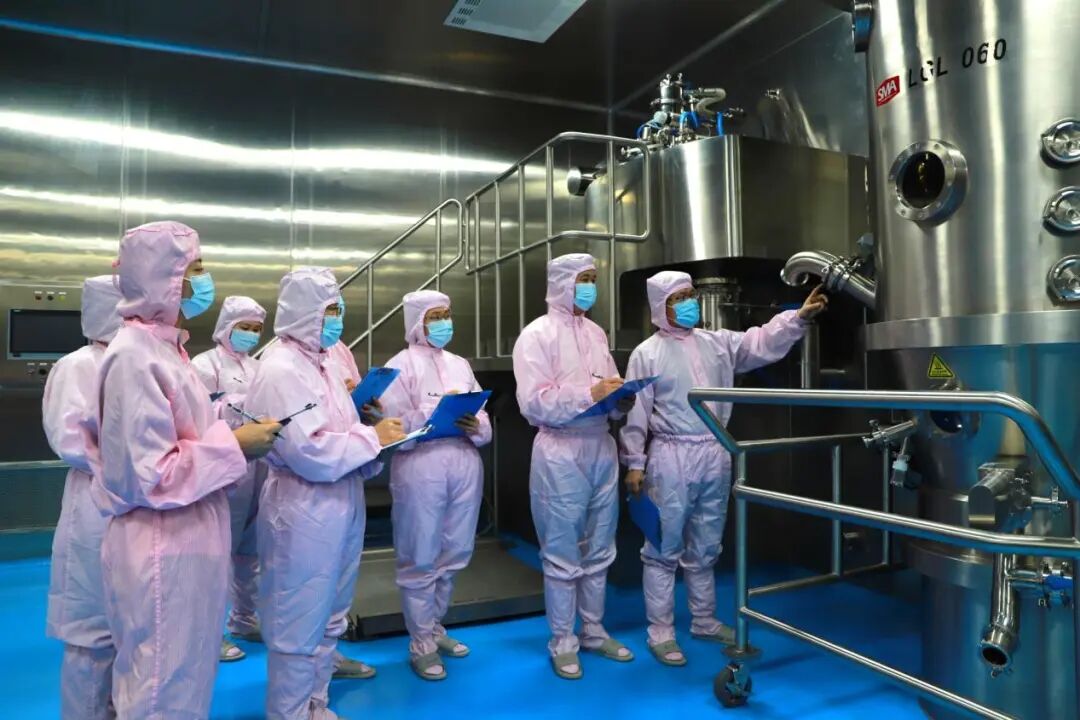 西南药业总工程师蒋猛带领技术、质量部门到口服固体制剂车间生产线进行检查。