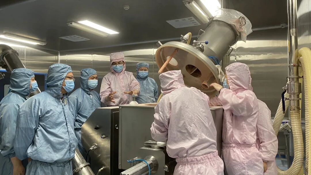 重庆市工人先锋号西南药业口服固体制剂车间的工艺技术人员,在车间配剂工段对新产品孟鲁司特钠咀嚼片工艺验证生产现场进行讲解和指导,操作人员聚精会神,认真听取工艺生产要点。