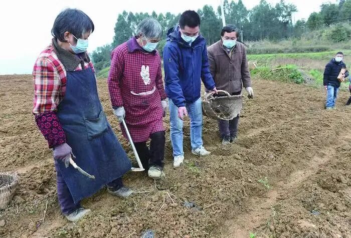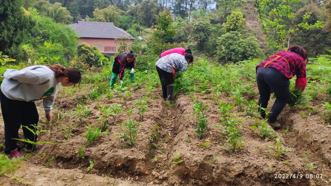 中药材种植公司员工到田间地头同当地村民一起进行中耕除草。