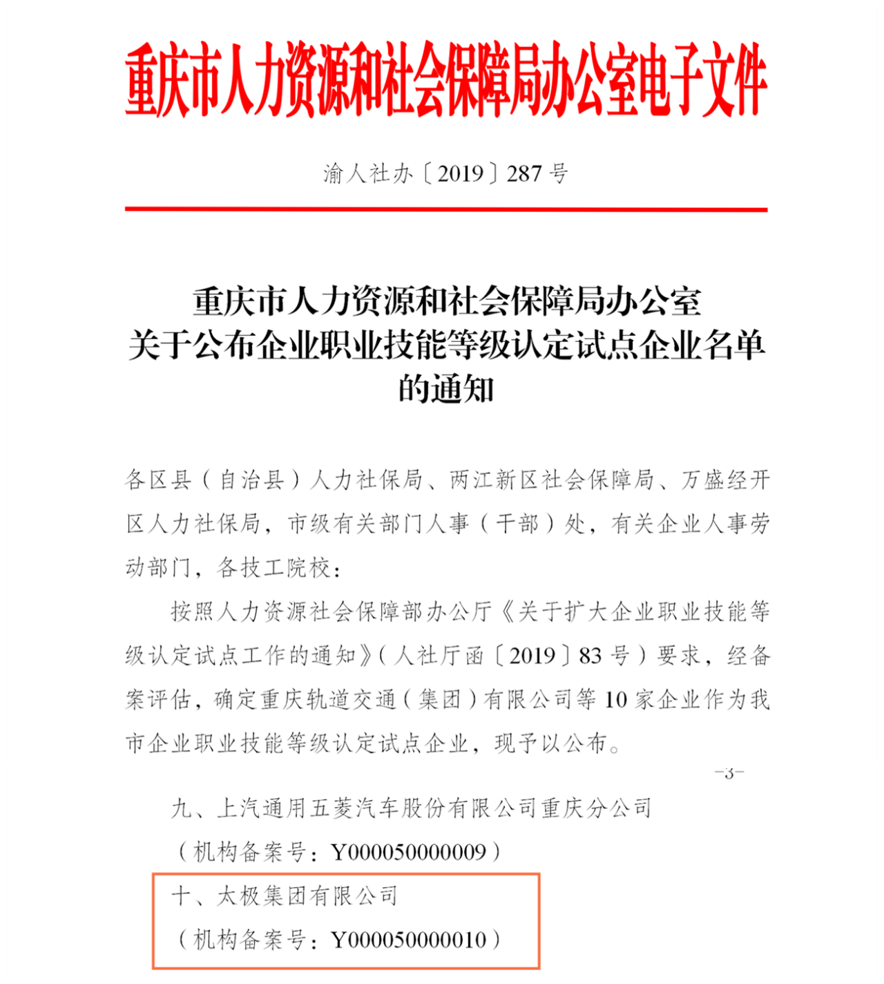 集团人事处多次向重庆市人社局专项汇报申报“技能认定中心”,得到了市人社局、市鉴定中心的高度重视,相关领导两次亲临集团考察调研。届时也正值国家人社部提出“深化技能人才评价制度改革,推行社会化职业技能等级认定”的方案实施阶段,经过努力申报,2019年12月,太极集团入选“重庆市首批10家企业职业技能等级认定试点单位”,正式成立太极集团职业技能等级认定中心,进入了技能认定的筹备期。