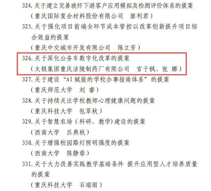 近日,国药太极涪陵制药厂职工代表提交的“深化公务车数字化改革”提案,入选2023—2025年度“聚合力 促发展”全国职工代表优秀提案名单。