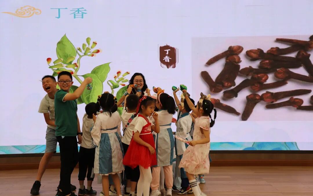 桐君阁连锁公司冯晓琴担任“中药传承专员”,带领孩子们从中药材的生长、性状、用途、功效等全面了解并认识了10 味常见的药食同源中药材。孩子们一边听,一边通过看、触、闻、尝摆放在桌子的中药材,并通过看图识药的趣味互动,加深了对中药材的认识。孩子们热情高涨,表现出对中医药知识的浓厚兴趣。