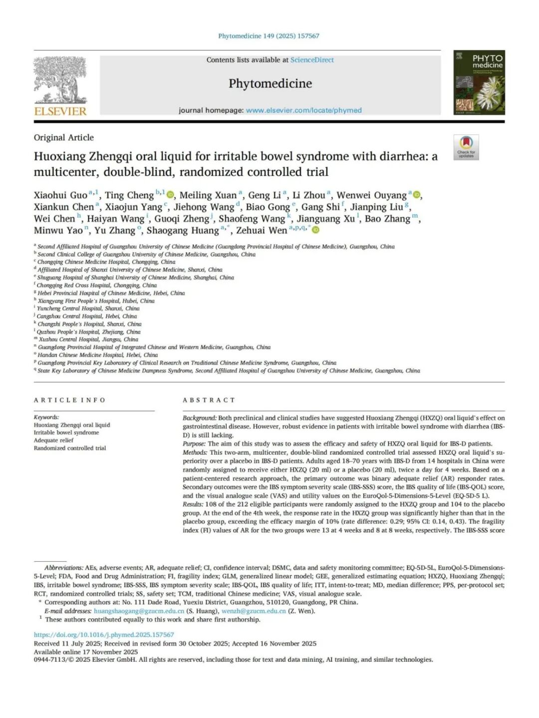 近日,太极藿香正气口服液治疗腹泻型肠易激综合征(IBS-D)的多中心、双盲、随机对照临床试验取得重大成果,相关研究论文已正式发表于国际权威期刊《Phytomedicine》(IF: 8.3)。这是继该产品在特应性皮炎治疗研究取得进展后,在拓展适应症领域取得的又一重大突破。