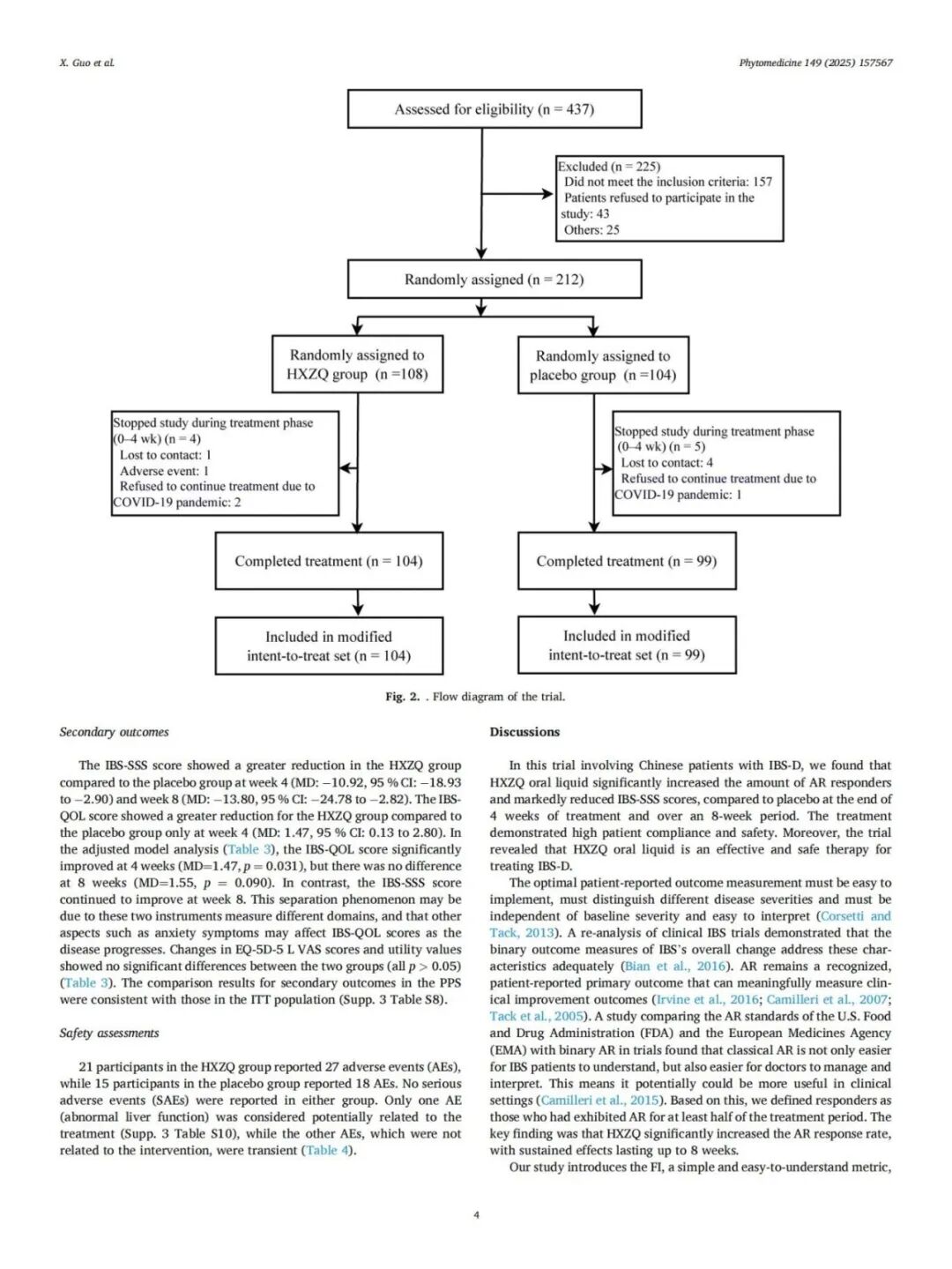 本研究系首个证实太极藿香正气口服液治疗IBS-D有效性与安全性的高质量临床研究。全国14家医院212名年龄在18-70岁的腹泻型肠易激综合征患者随机对照研究的结果表明,采用太极藿香正气口服液治疗4周后,明显缓解应答率(79.8%)显著高于安慰剂组(53.3%),优效界值超过10%,且这一优势延续至第8周。本次研究亦显示药物安全性良好,患者具有较高的依从性。