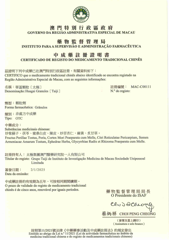 1月2日,国药太极华盖颗粒成功获得澳门药物监督管理局颁发的《中成药注册证明书》,为该局成立后批准的首个经典名方中药复方制剂。太极华盖颗粒处方来源于宋代《太平惠民和剂局方》中的“华盖散”,具有宣肺解表,祛痰止咳的功效,用于素体痰多,肺感风寒,是国药太极呼吸系统领域除“急支糖浆”外又一代表品种。