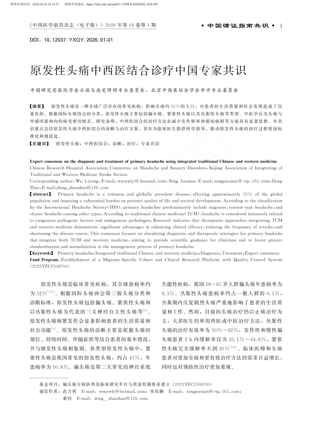 原发性头痛是全球范围内常见的神经系统疾病,包括偏头痛、紧张性头痛、丛集性头痛等多种类型,严重影响患者的生活质量与社会功能。