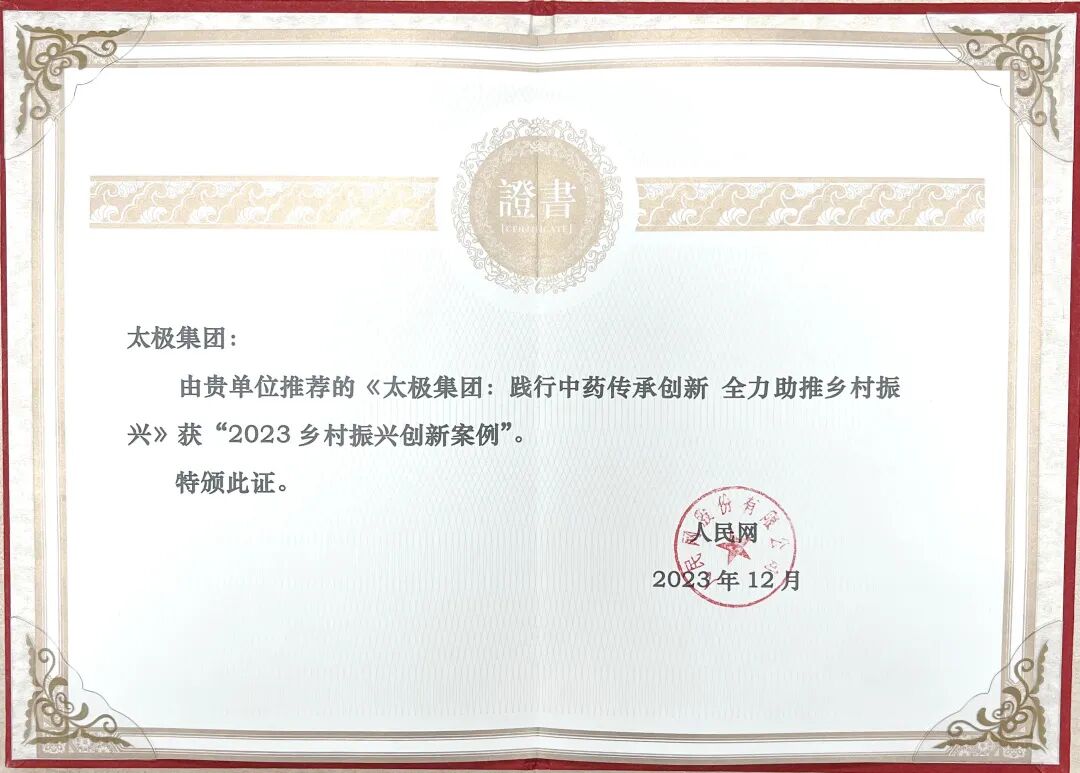 太极集团长年来守正创新,在夯实自身主业基础上,加速推动中药特色产业向精深加工、高附加值方向发展,在中药产业振兴与乡村振兴的深度融合方面成果颇丰。而本次太极集团获得创新案例证书,也表明了公司以中医药创新融合助力乡村振兴方面的宝贵经验得到了业界高度认可。