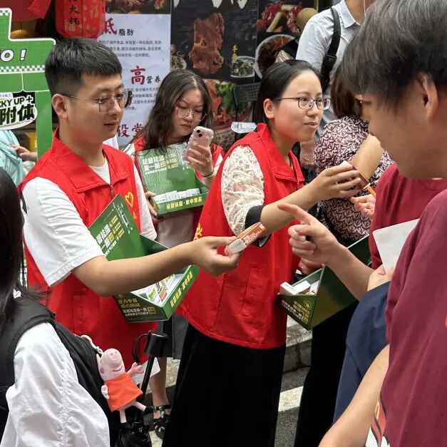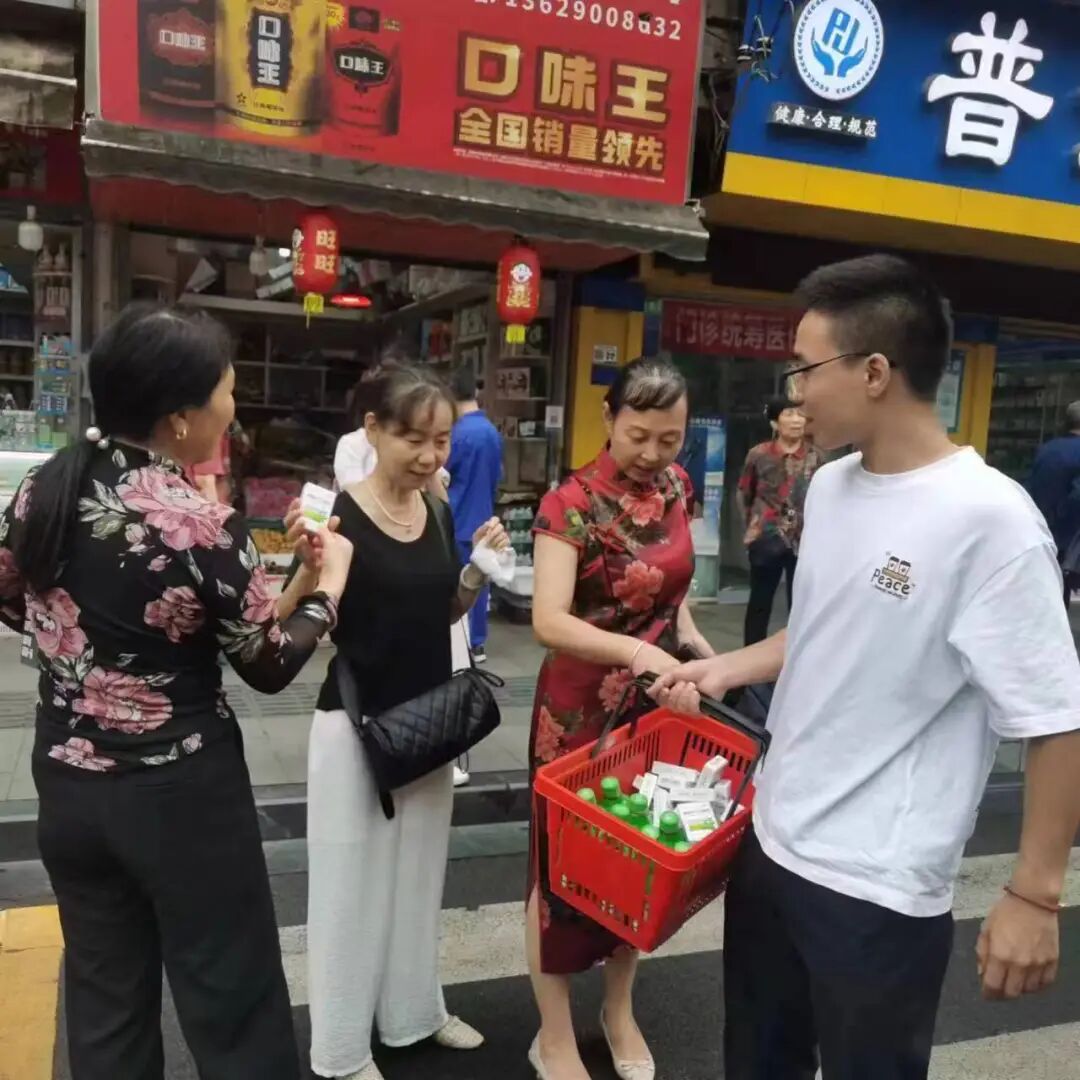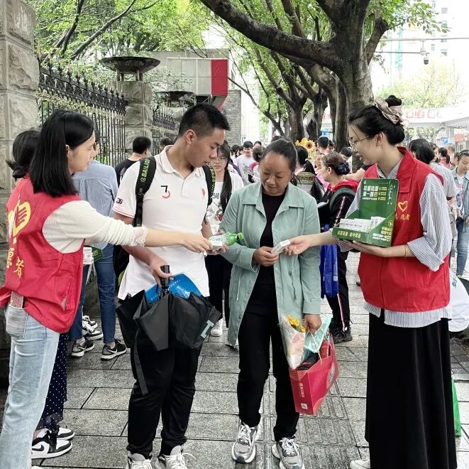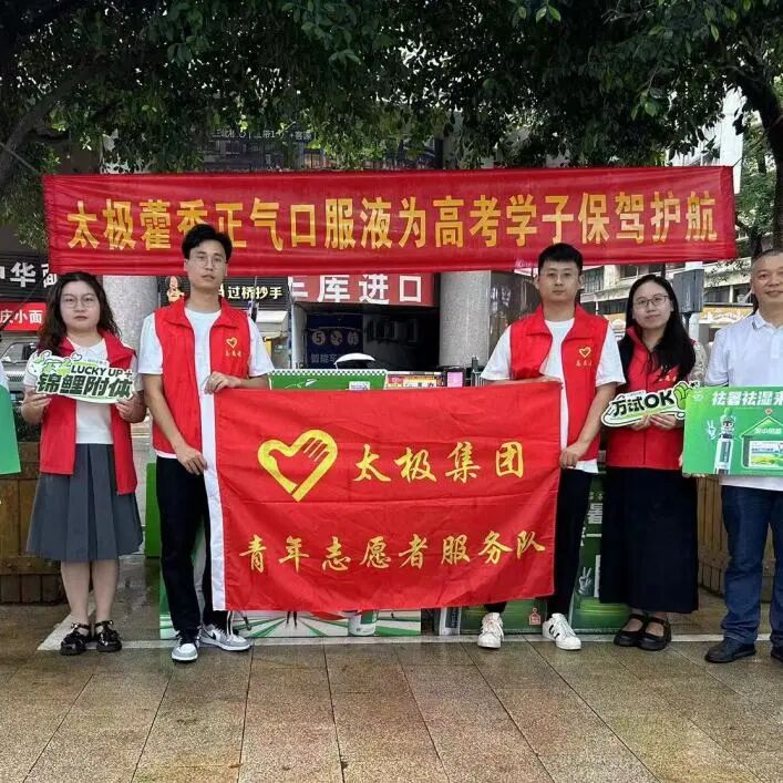 国药太极青年志愿者们值守考点,为现场焦急等待的家长和辛勤工作的护考人员赠送藿香正气口服液。红色的志愿者马甲,绿白相间的藿香衫穿梭在人群中,在全国各大考点形成了一道清凉风景线。