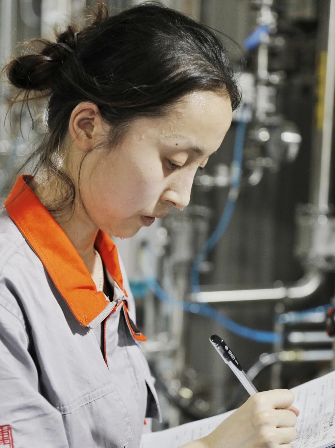 涪陵制药厂龙桥中药前提取车间技术员坚守在46度高温的巡查岗位上。