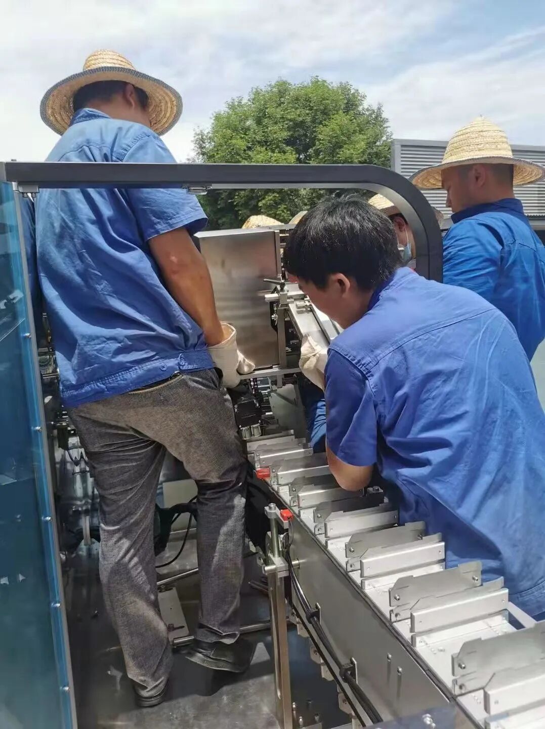 桐君阁药厂包装车间的工人在40度高温下,为设备早日投入生产,正在搬运设备。