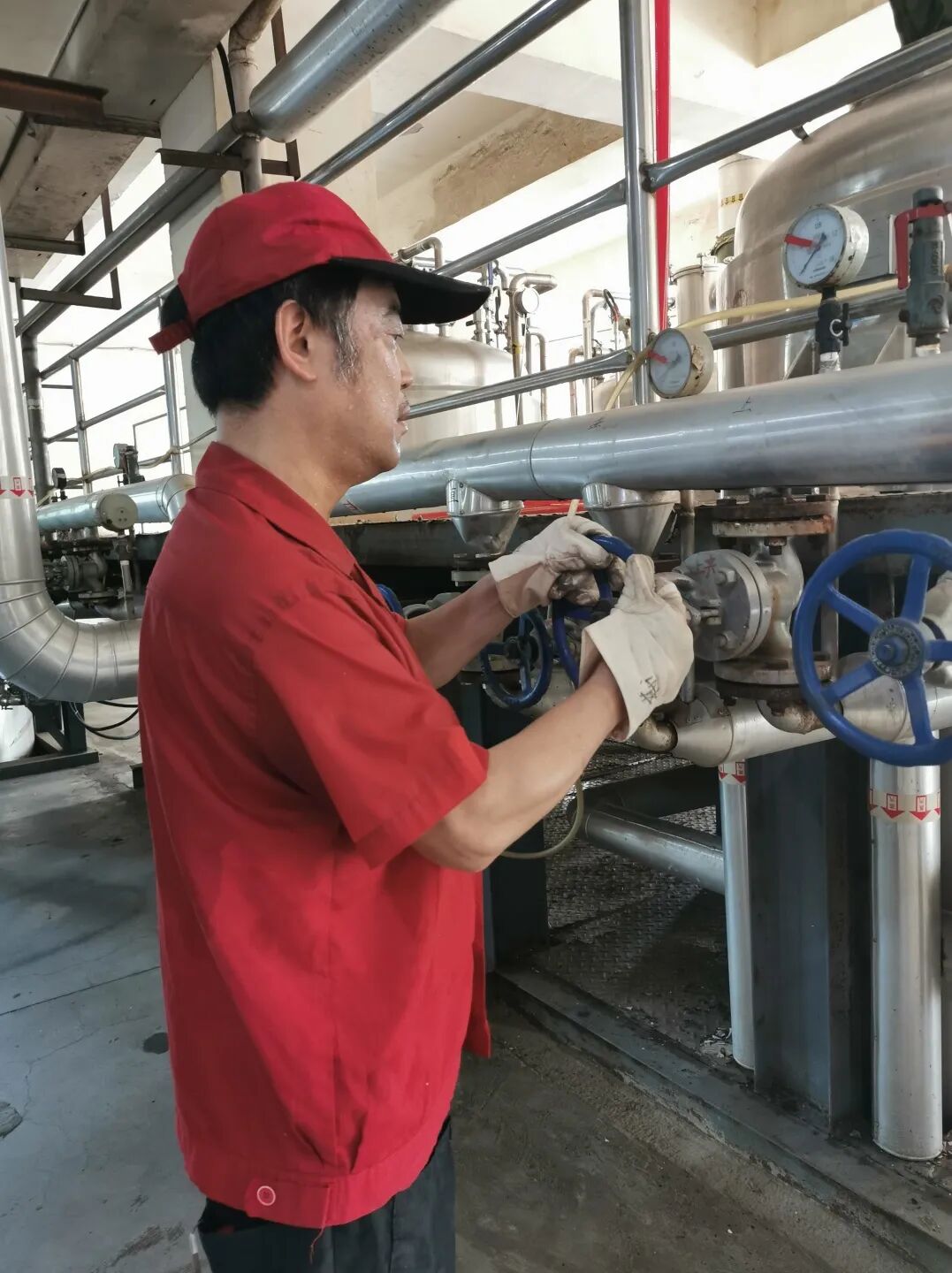 中药二厂前处理车间员工在滚滚热浪下操作提取罐。